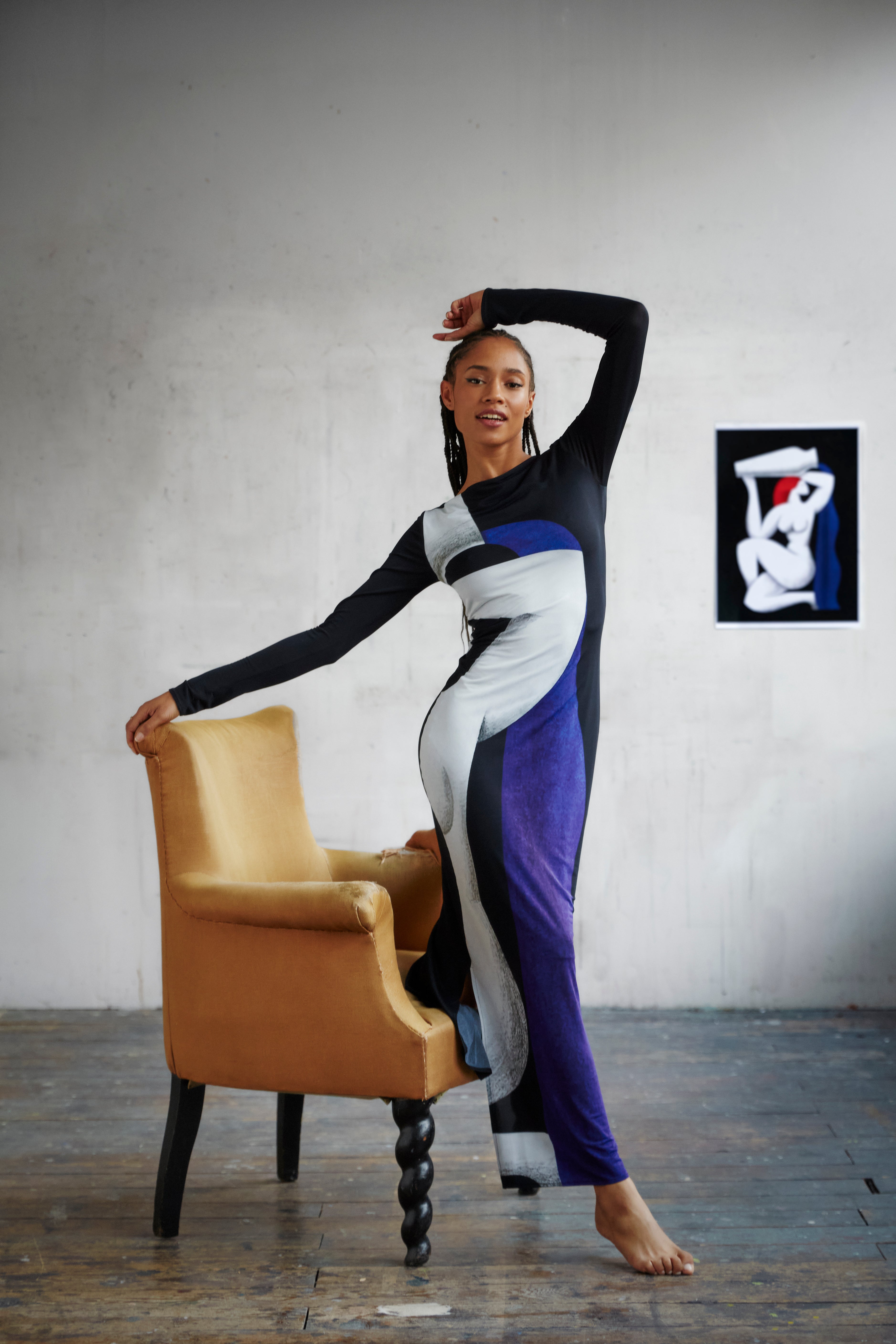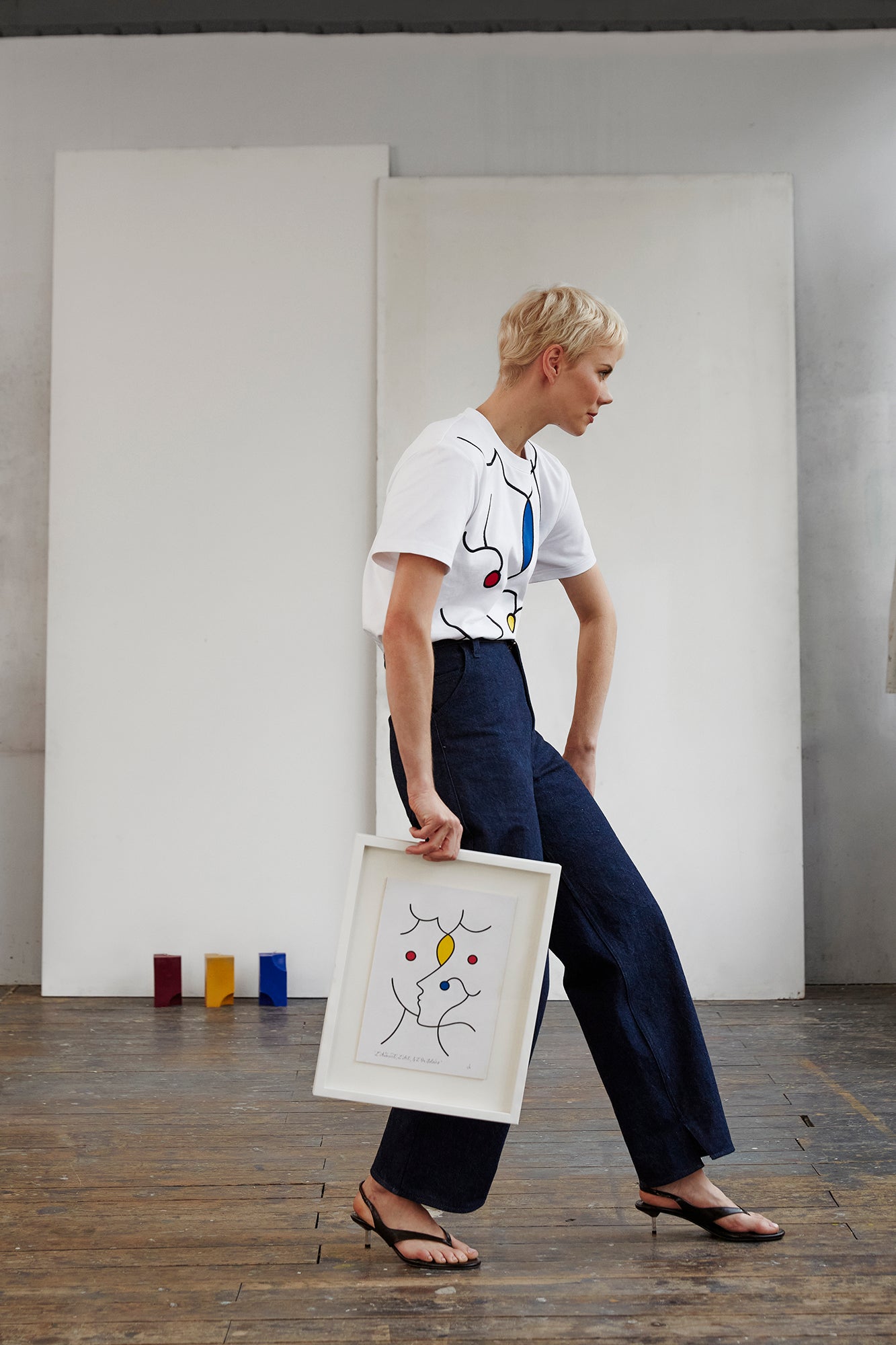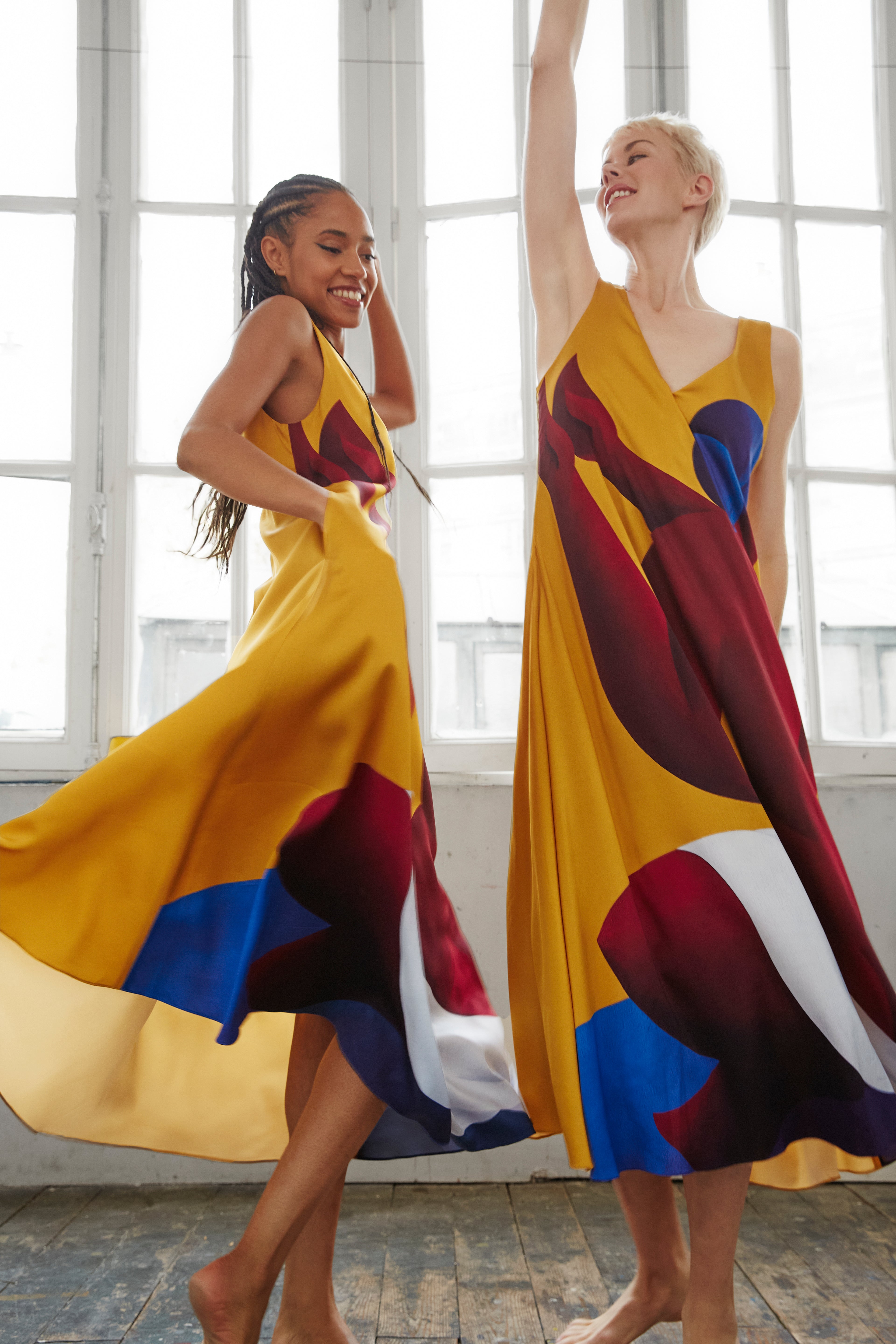 It brings together a long dress with a bold design—delicate yet comfortable—and silk shirts to wear with masculine ease over the AYT jeans or layered over a dress.