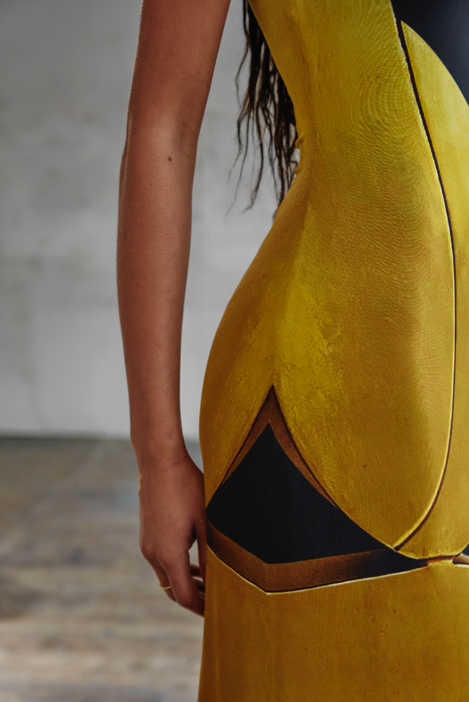 En esta serie, quise celebrar a la mujer poderosa y asertiva en toda su feminidad. Una mujer que no se convierte en la musa de nadie, sino en la suya propia. Me pareció muy natural que esto se interpretara en un material fluido, casi como una segunda piel, para conservar una sensación carnal y auténtica .
